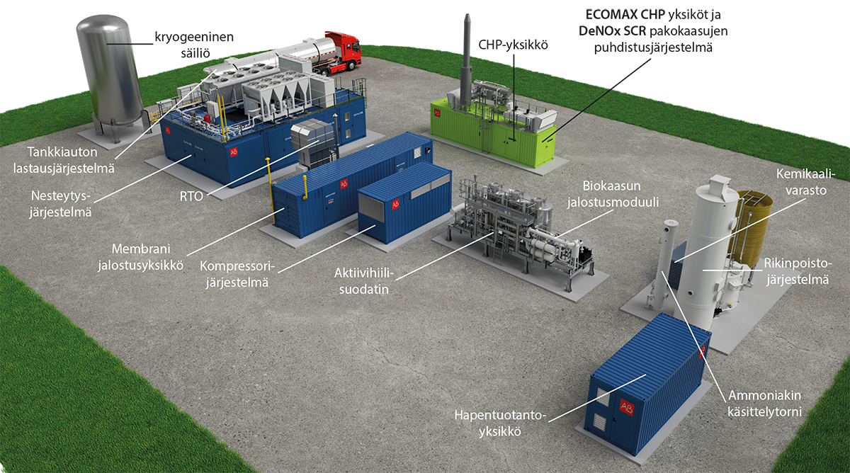 AB ENERGY: BIOCH4NGE biokaasun jalostuslaitokset, CH4LNG metaanin ja hiilidioksidin nesteytyslaitokset sekä Ecomax BIO CHP laitokset.